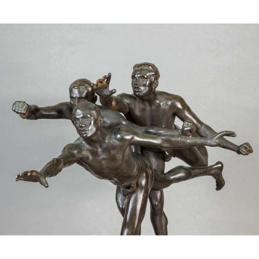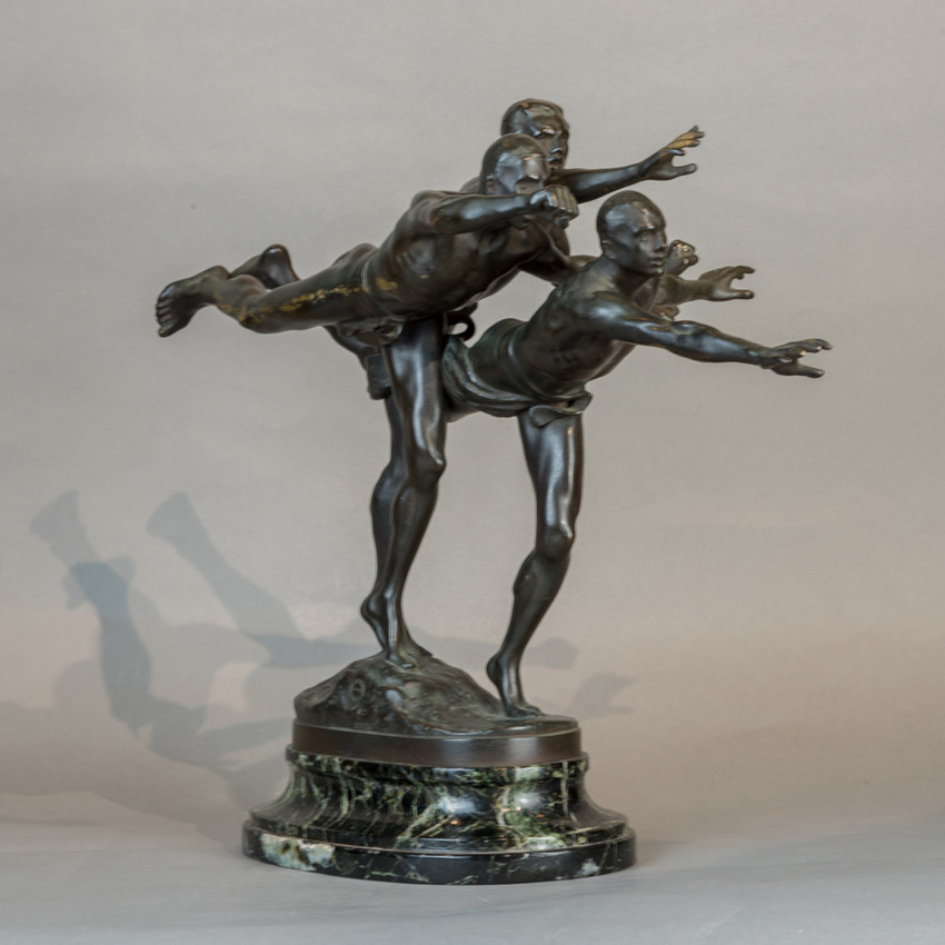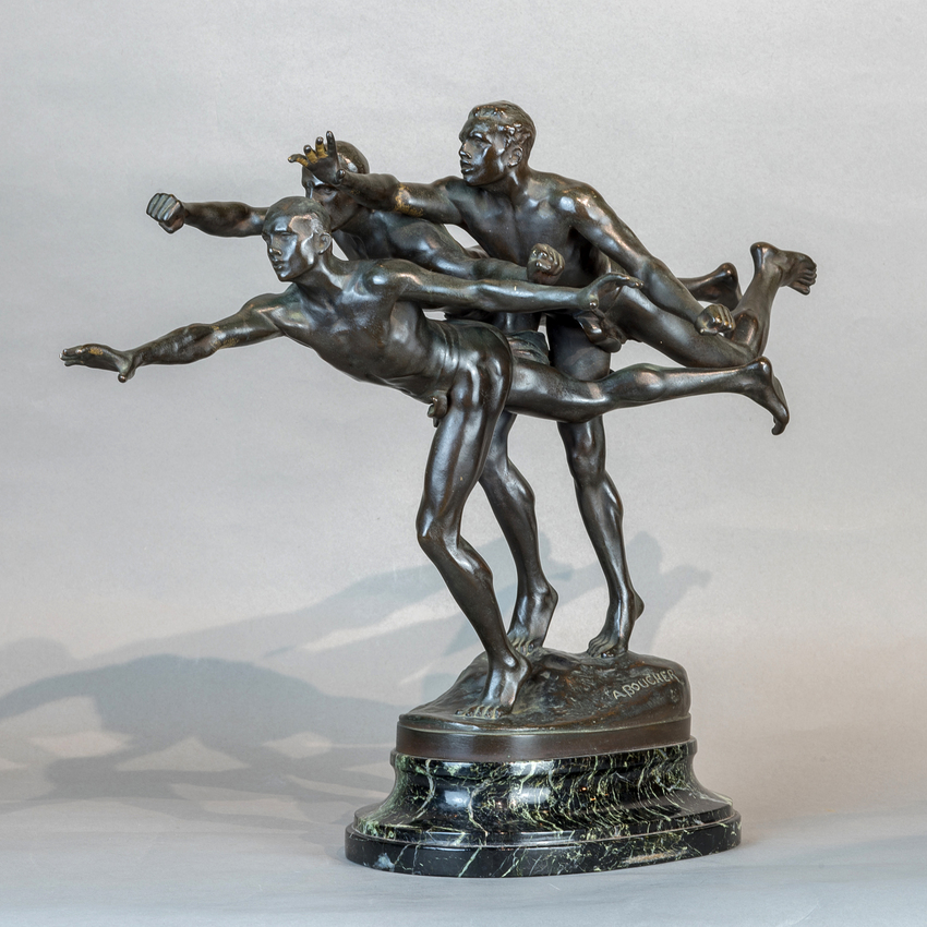 A fine patinated bronze figural group sculpture entitled “Au But” (The Finishing Line) on marble base. Cast by Siot-Decauville from a model by Alfred Boucher; with Siot-Decauville foundry cachet and stamped 117