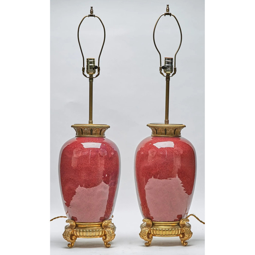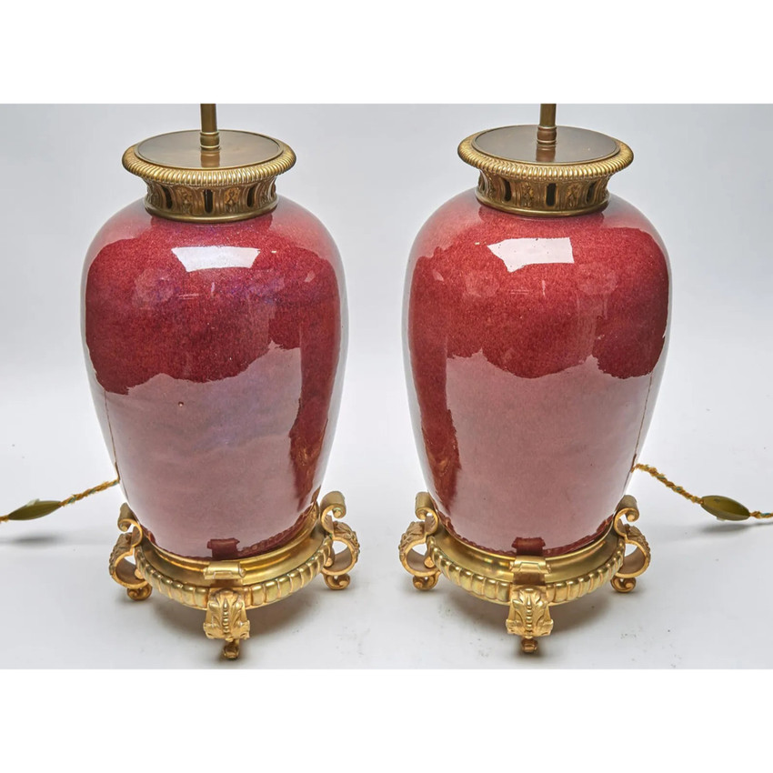 Pair of Bronze Mounted Oxblood Porcelain, high shine, Vases Mounted as Lamps with gilt bronze feet.